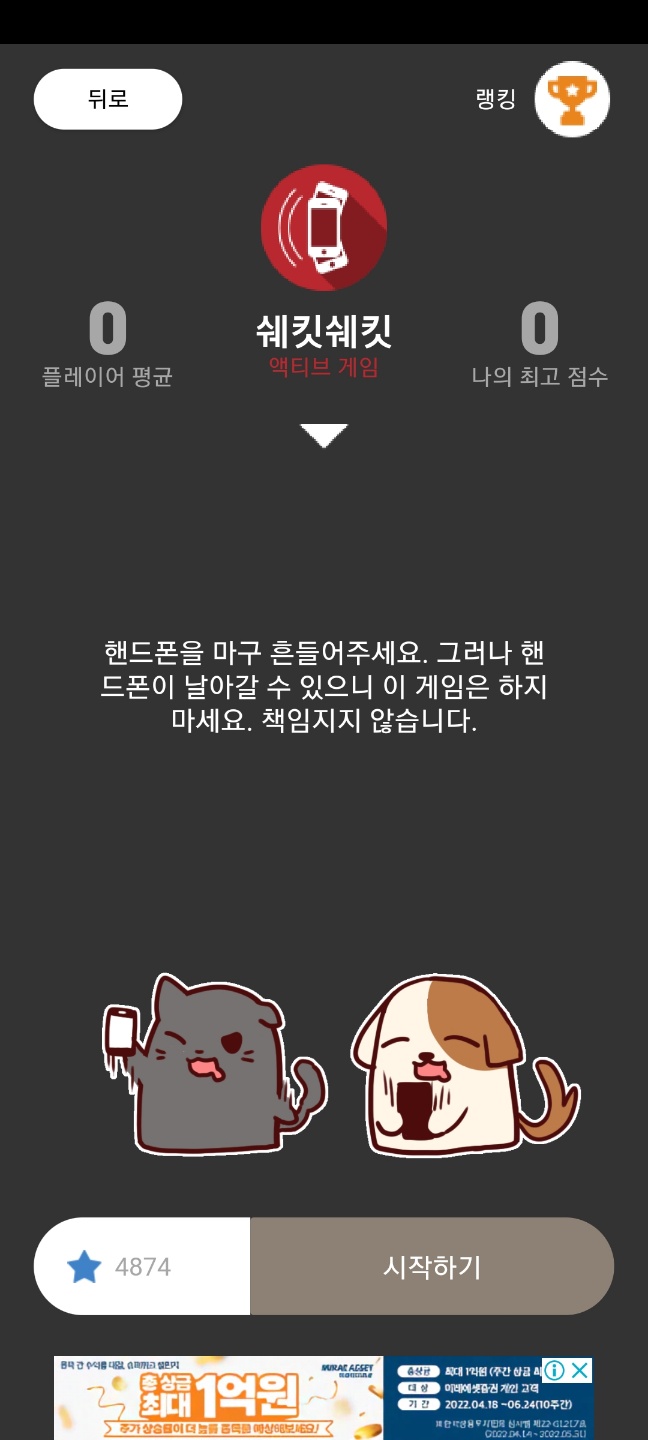 쉐킷쉐킷 게임모드는 말그대로 마구마구 핸드폰을 흔들어야하는 게임입니다!! 마구마구 흔들다가 핸드폰이 날아갈 수 있으니!! 조심하세요 :)