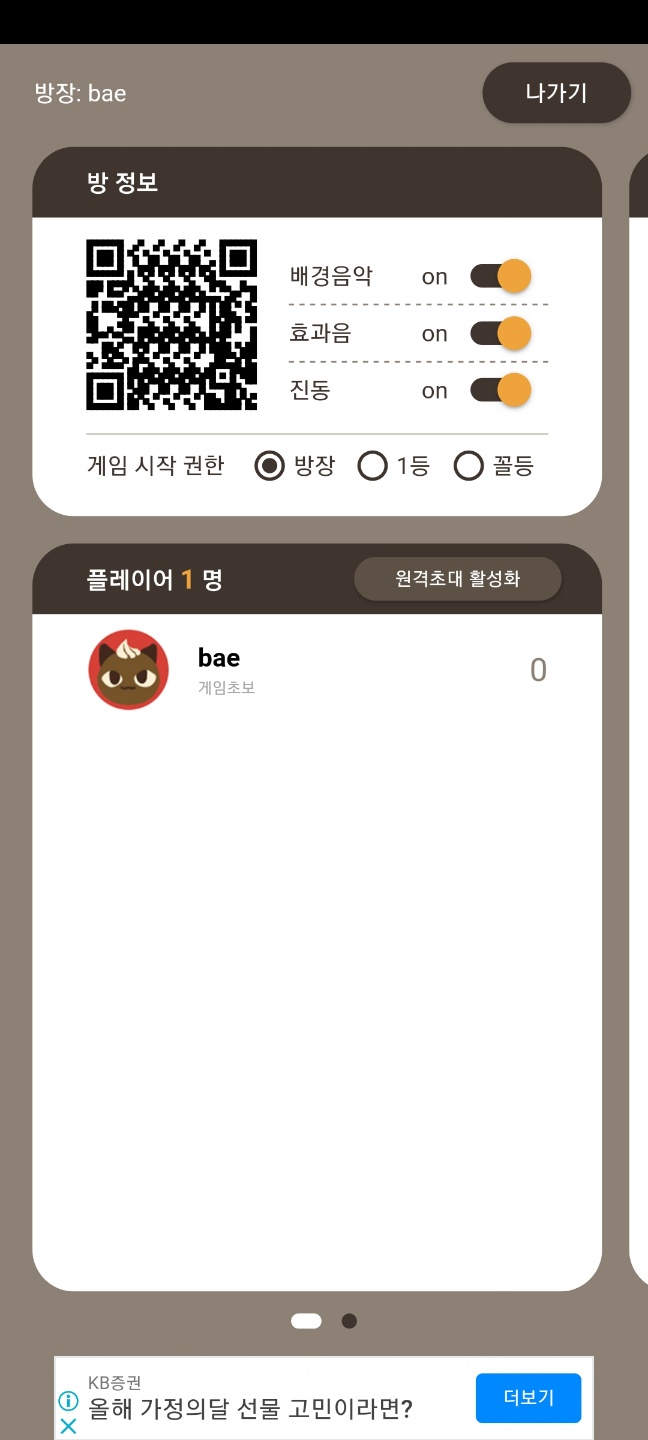 한 사람만 방을 만들면 되고, 나머지는 방찾기를 통해 해당 방에 들어가시면 됩니다. 들어가는 방법도 아주 간단합니다!! 큐알(QR)코드 한번이면 게임 입장이 가능하죠!!
