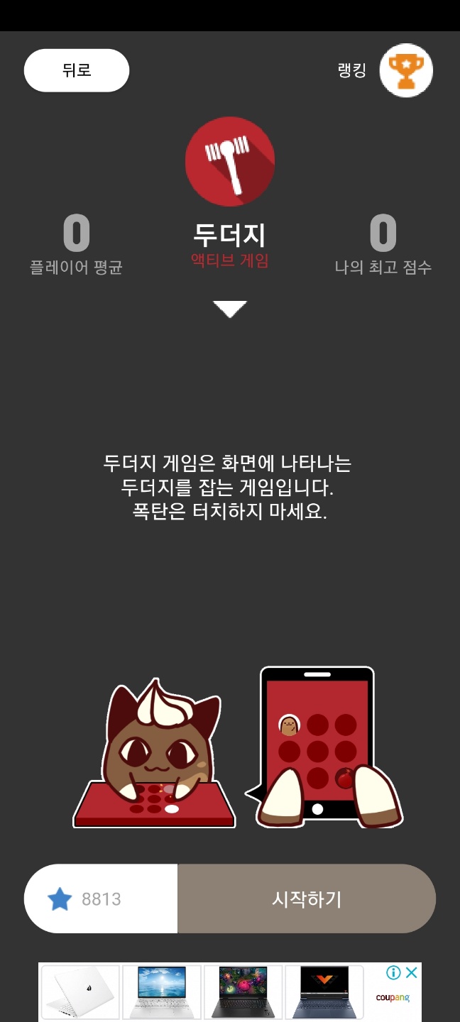두더지 게임은 모두가 아시겠지만, 말그대로 두더지를 많이 잡으면 됩니다. 다만 중간중간 나오는 폭탄을 터뜨리게 되면 점수가 떨어지니!! 이점은 꼭!! 주의하세요 :)