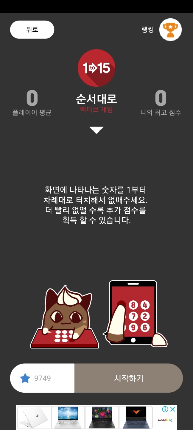 순서대로 게임은 1부터 15까지 숫자를 차례대로 찾아서 없애주면 되는 게임이에요!!! 게임룰은 쉽지만 막상 술한잔 걸치고 찾으려면 잘 안보일 수 있습니다!!!^^
