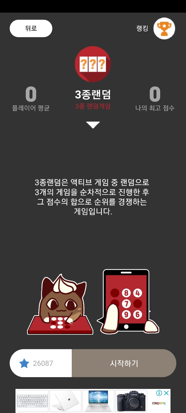 공평한게 좋다면 3종랜덤이 최고죠!^^ 어플에 현존하는 게임중에서 랜덤하게 3종목을 연속으로 플레이하고, 총점수를 합산하여 순위가 매겨집니다!!