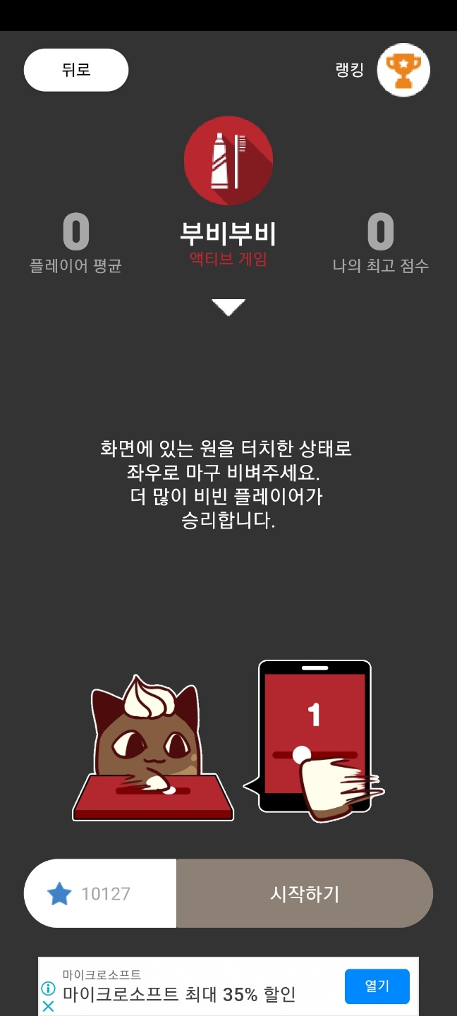 이번에는 부비부비 게임모드 입니다! 이건 화면에 있는 동그란 원을 좌우로 마구 비벼서 다 많이 비빈 사람이 높은 점수를 얻는 게임이에요!! 아주 심플한 술게임중 하나죠!!
