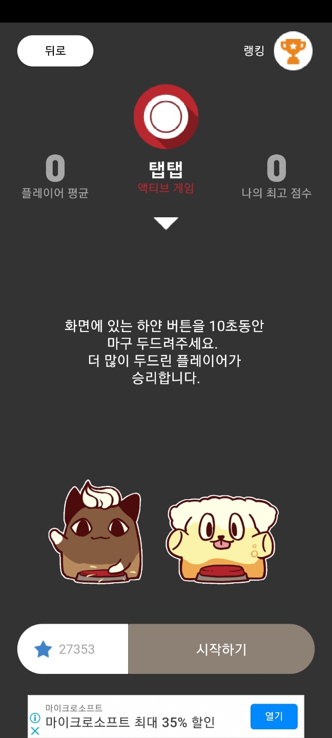 탭탭 게임은 화면안에 있는 동그란 버튼을 10초동안 누가누가 제일 많이 누르는지 대결하는 게임입니다!