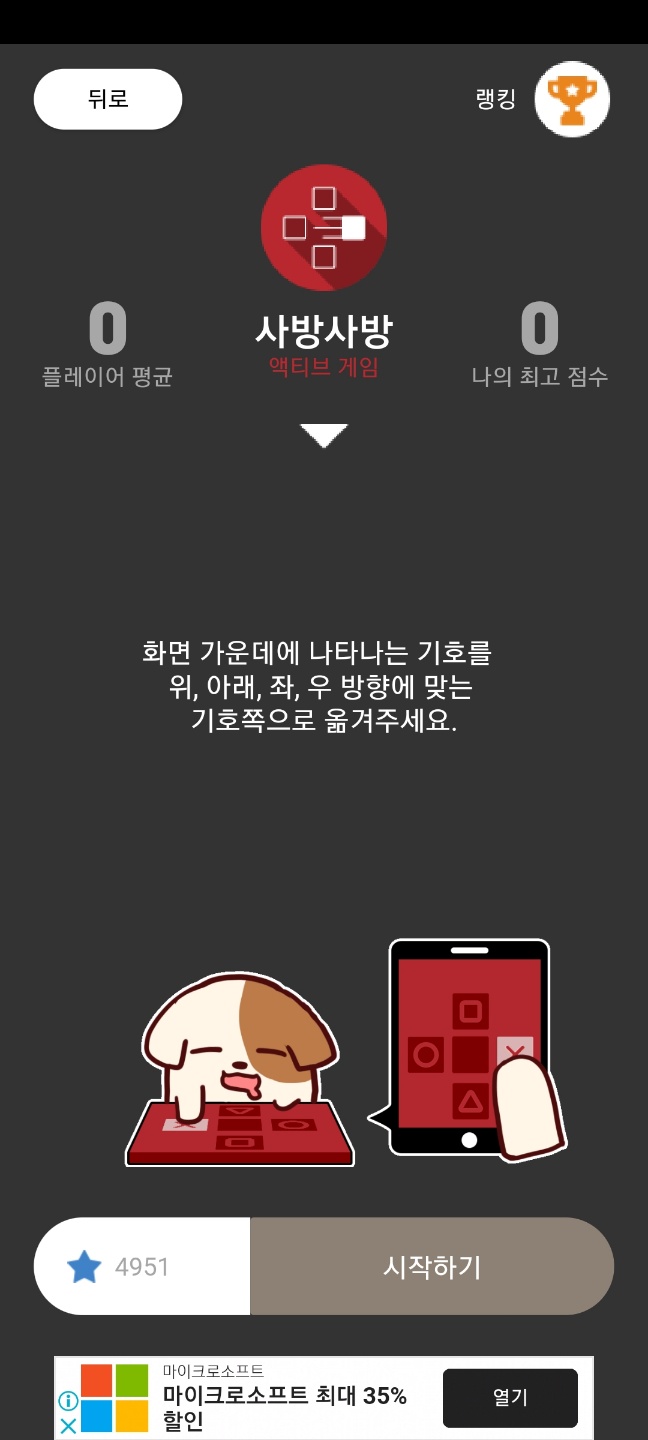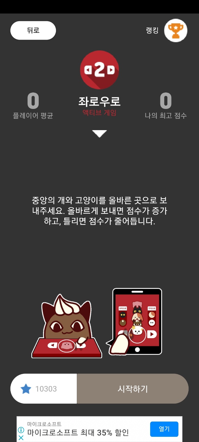 가운대서 내려오는 고양이와 개를 위치에 맞게 분리해주는 게임이에요!!^^ 잘못보내면 점수가 떨어지니 막 누르시면 안됩니다!!!! 절대로요!!